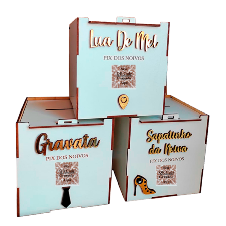• 1 Caixa Pix Urna p/ Casamento Personalizada c/ QR CODE Noivos – Lua de Mel – Gravata – Sapatinho da Noiva